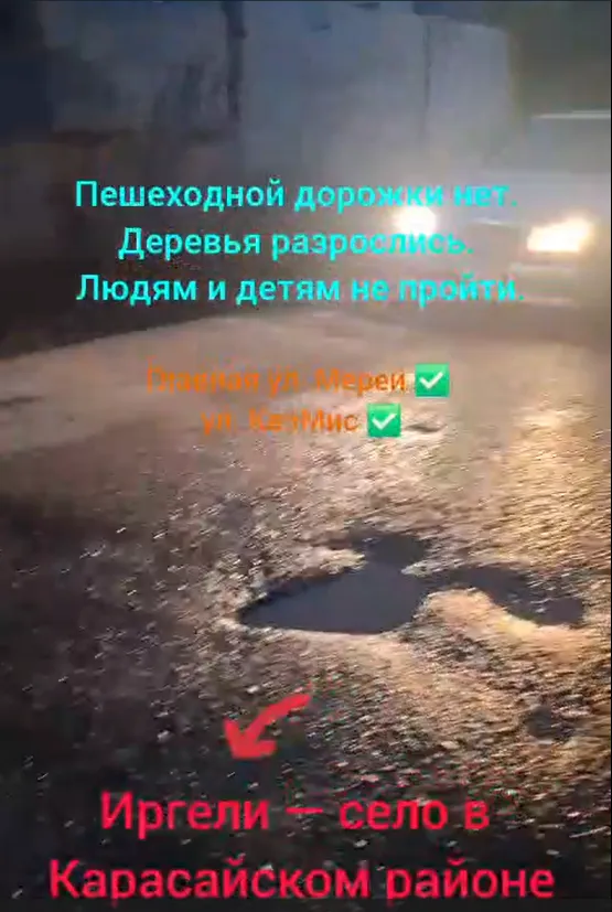 «Дороги убитые. 2 года назад положили асфальт, но он только зиму отстоял, а весной вместе со снегом растаял. К властям мы обращались, но они не комментируют. Сколько раз мы писали, отправляли видео - вообще нет никакой реакции. Скоро начнется школа. Узкая дорога без тротуара создает опасность для детей. К тому же они постоянно ходят по грязи. Постоянно там аварии случаются – машины царапаются. Хорошо, что людей не сбивали никогда», - рассказал житель села Иргели по имени Канат.
