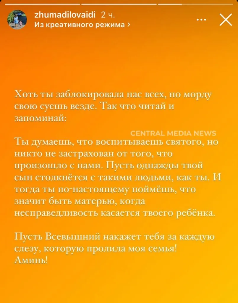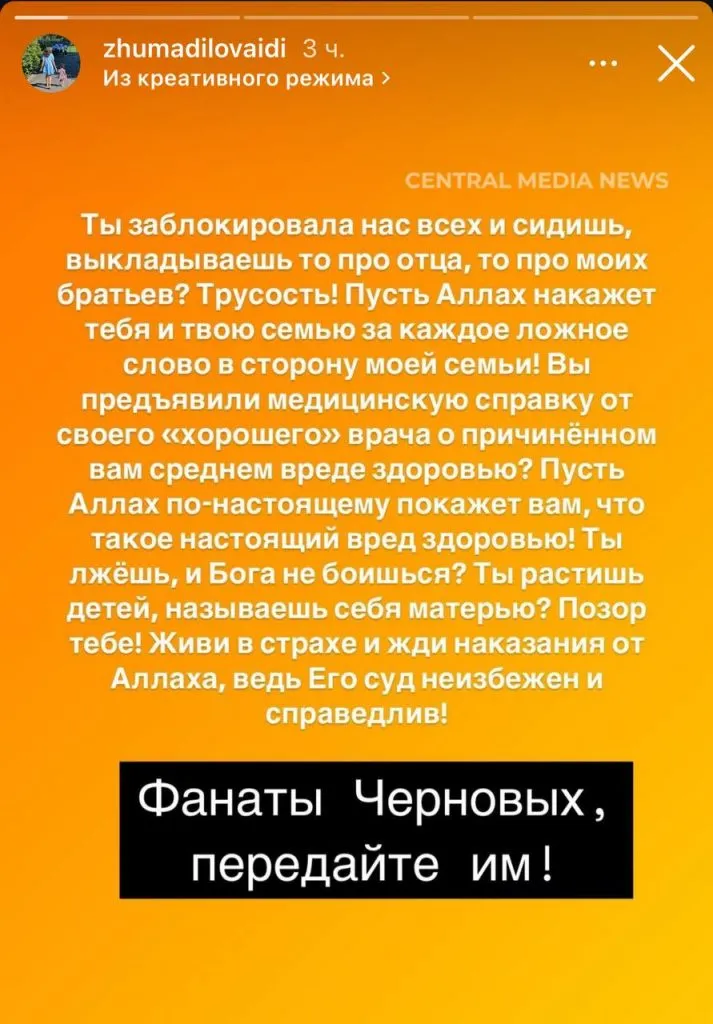 «Ты (речь идёт об Анне Черновой — прим. ред.) заблокировала нас всех и сидишь, выкладываешь то про отца, то про моих братьев? Трусость! Пусть Аллах накажет тебя и твою семью за каждое ложное слово в сторону моей семьи! Вы предъявили медицинскую справку от своего "хорошего" врача о причинённом вам среднем вреде здоровью? Пусть Аллах по-настоящему покажет вам, что такое настоящий вред здоровью! Ты лжёшь, и Бога не боишься? Ты растишь детей, называешь себя матерью? Позор тебе! Живи в страхе и жди наказания от Аллаха, ведь Его суд неизбежен и справедлив!», — написала дочь Даулета Турлыханова в посте.