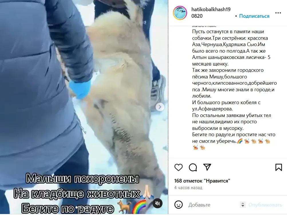 «Собачек стреляли в разных концах города. Это значит, машина целый день ездила и они стреляли, не смотря на то, что люди звонили и обращались в полицию и акимат. Получается, какое-то показательное убийство. Пять собачек убили на озере, и две ранены – отстрел целенаправленно вёлся. Посмотрите кого вы убили: щенков! Кому они представляли опасность?», – написали в социальных сетях неравнодушные, которые позже организовали похороны для животных.