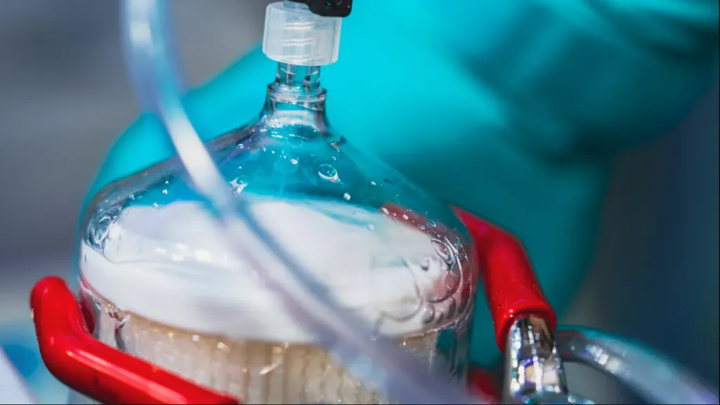 Но на этом процедура не завершается. Далее, уже на месте, пациента помещают в крио-камеру, и охлаждение продолжается. В начале температуру понижают до -120°C. На этом этапе начинается процесс так называемой витрификации или «стекловидного замораживания».