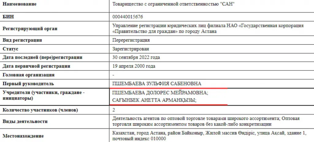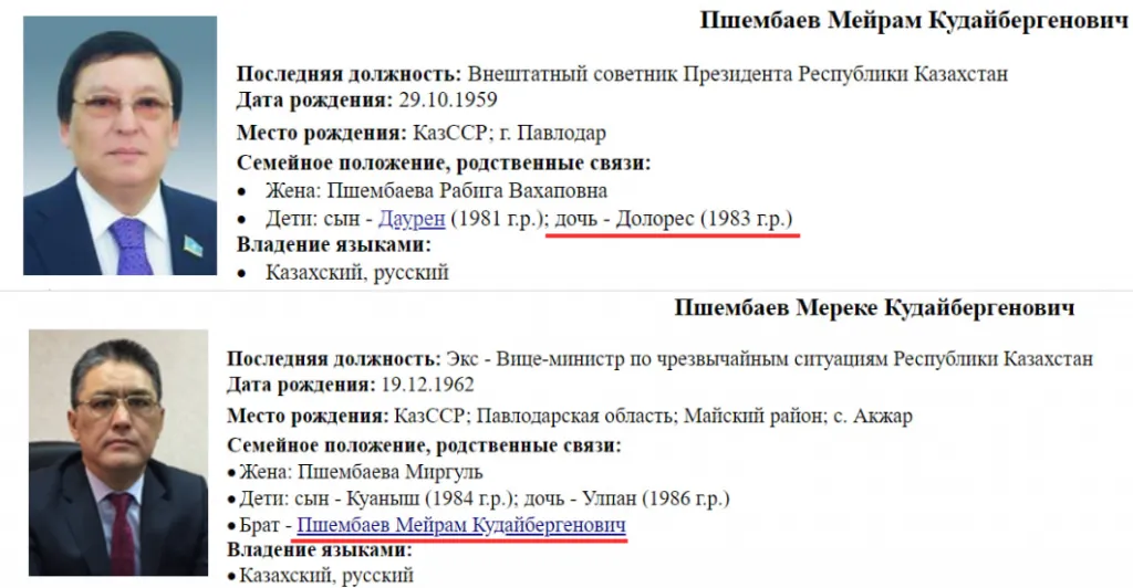 Этой компанией в свою очередь руководит Зульфия Пшембаева, а учредители — Анетта Сагынбек и Долорес Пшембаева. Отец последней — экс-депутат мажилиса, внештатный советник Касым-Жомарта Токаева, председатель правления Союза машиностроителей Казахстана Мейрам Пшембаев. Дядя Долорес — бывший вице-министр по чрезвычайным ситуациям Мереке Пшембаев.