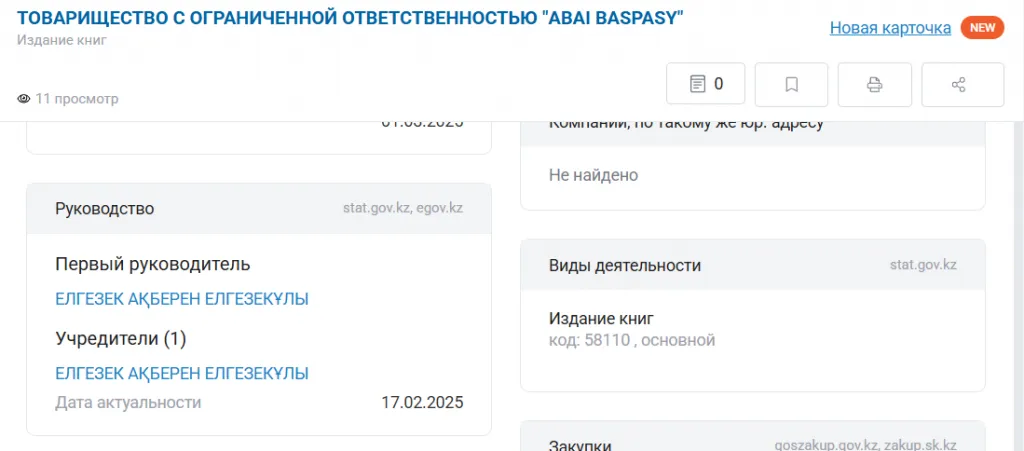В Управлении культуры, архивов и документации Алматинской области нам ответили, что в период с 2017 по 2024 год издательство «Abai baspasy» «не участвовало в тендерах акимата Алматинской области и не заключало контракты на поставку книг». В сети действительно не нашлось госконтрактов издательства с Алматинской областью.