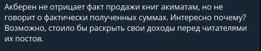 }}Как утверждает канал, он продал книги нескольким акиматам разных областей. Авторам кажется странным, что Акберен не говорит открыто о полученных от сделок суммах.