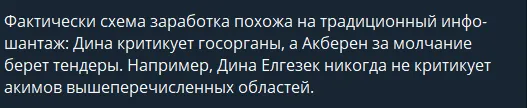 Возвращаясь к Дине Елгезек, источник отмечает, что в своей критике власти блогер никогда не упоминает акимов Алматинской, Мангистауской, Кызылординской и Жамбылской областей. Такой расклад авторы поста назвали «похожим на инфо-шантаж».