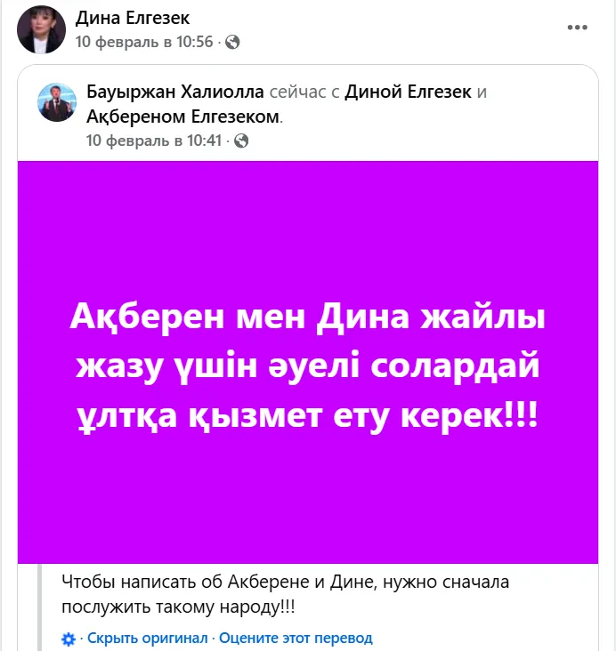 Или вот ещё, в своём посте Дина приводит слова некого Ахата Нуртаса: